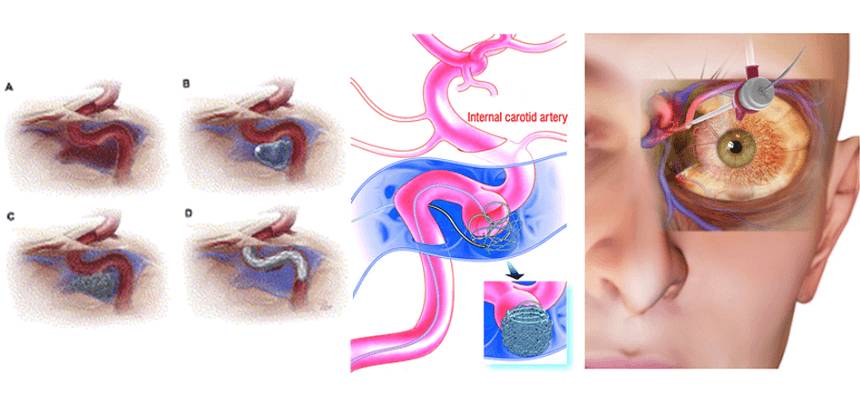 When an abnormal connection happens between either of the carotid arteries and the veins just behind the eye, it is called a carotid . Because the carotid arteries have a greater pressure of blood flow than do the veins, the rush of blood prevents the veins that serve the eyes from draining properly. The blood pressure starts to build up in the eye, causing it to bulge. The eye turns red. As the condition gets worse, a person may start losing his or her vision. Without treatment, the sight can be lost in that eye. Coil Embolization for Carotid Cavernous Fistulas: Treating a carotid cavernous fistula with embolization involves placing small platinum coils where the abnormal connection is. This separates the blood flow of the carotid arteries from that of the veins. As a result, the blood can drain properly from the eyes. Coil embolization is done in an angiography suite. While the patient is given a general anesthetic, the procedure doesn't require any incision into the head or skull. During the procedure, a small tube is placed through an artery in the groin. The tube is advanced up to the arteries in the neck. Another smaller tube is threaded through the first one. Small platinum coils are delivered to the abnormal connection through the second tube. The coils separate the blood flowing in the arteries from the blood flowing in the veins. Coil embolization treatment often completely reverses the disabling symptoms in the eye, if treated early enough.